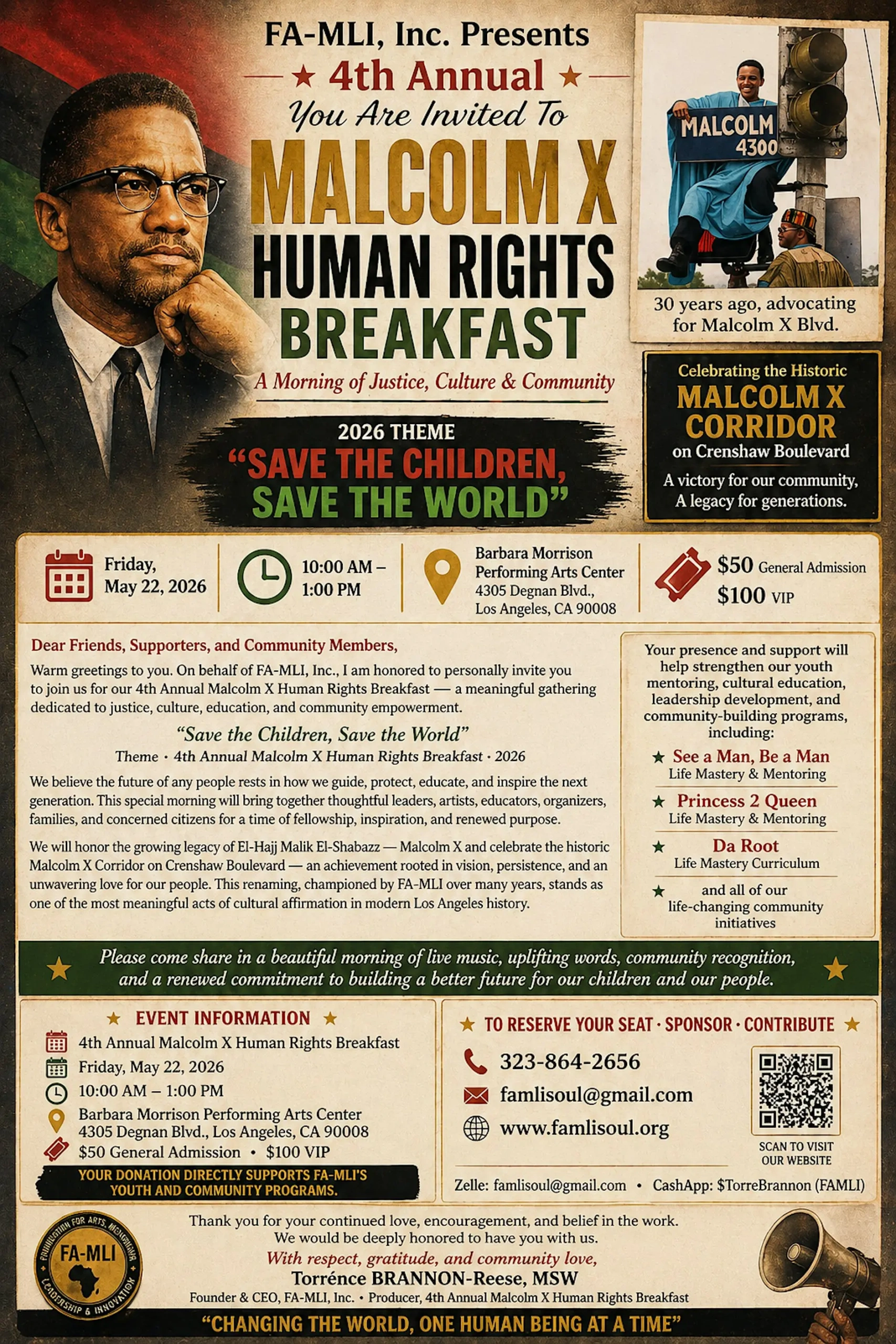 This event builds directly on FA-MLI’s historic achievement โ the official co-naming of a five-mile stretch of Crenshaw Boulevard as the Malcolm X Corridor in May 2025, a 30-year campaign led by Torrรฉnce Brannon-Reese and supported by Councilwoman Heather Hutt.